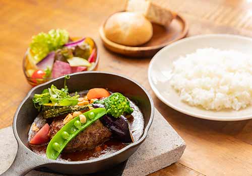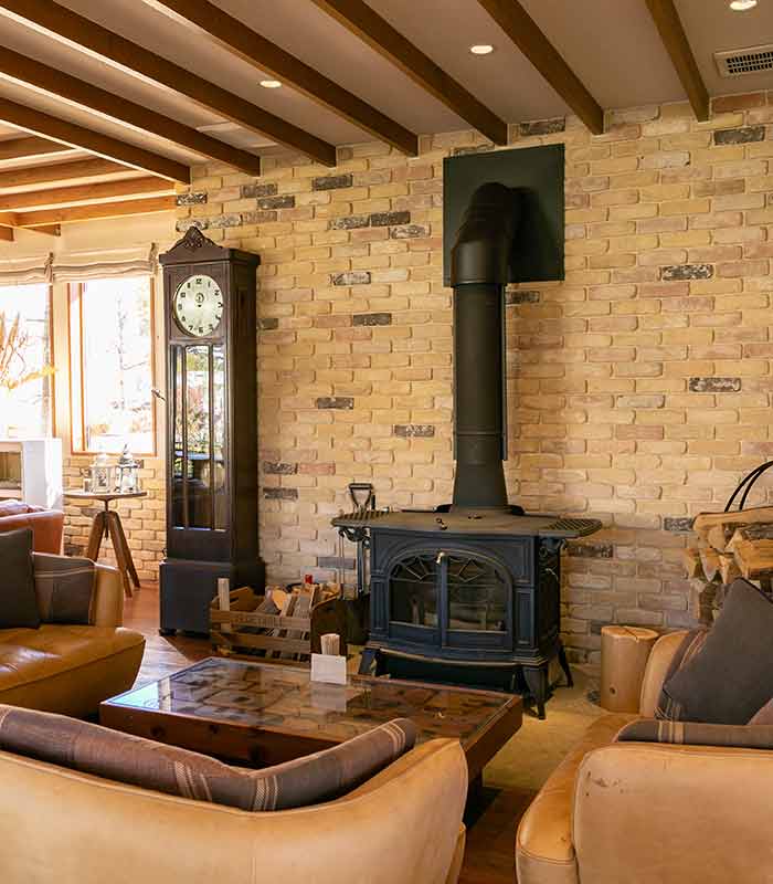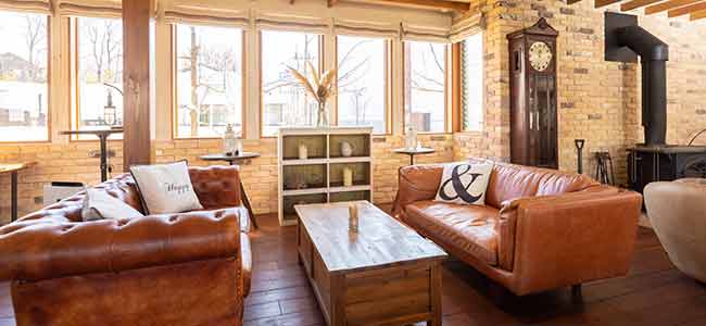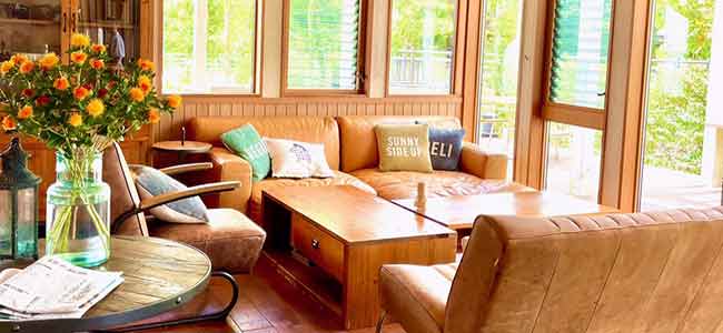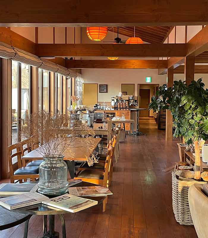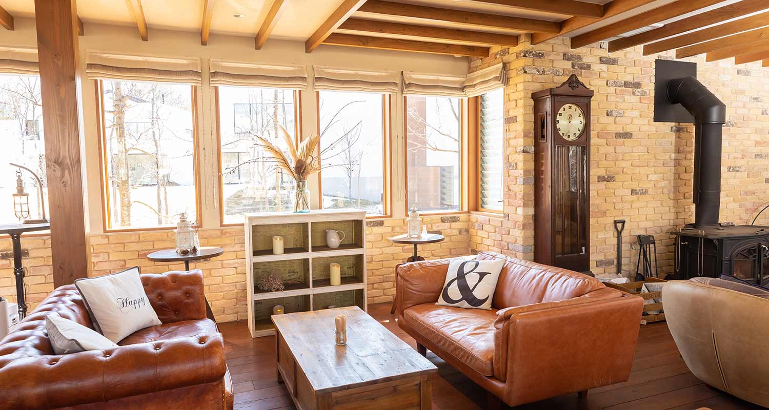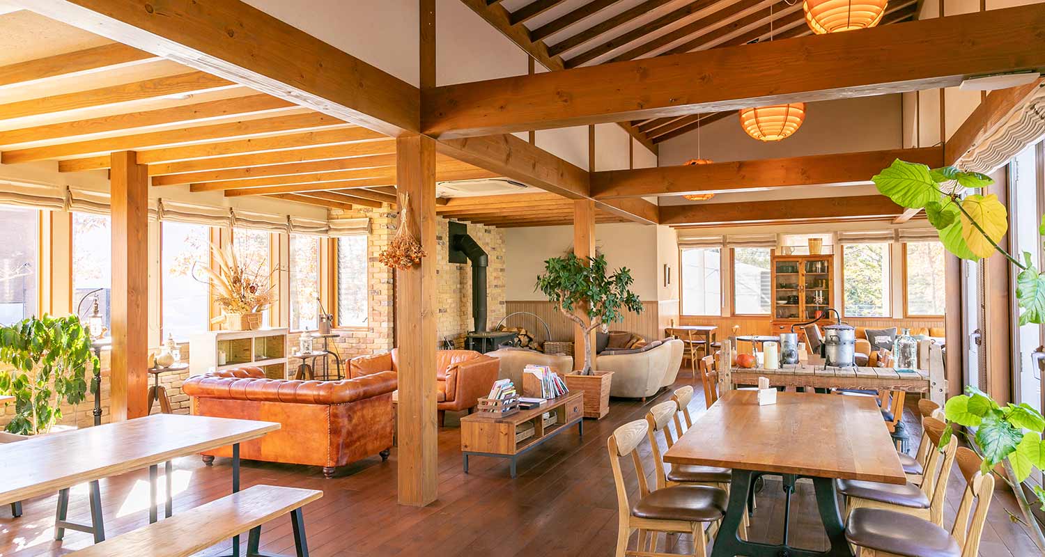 不揃いのヴィンテージ家具たちがさまざまな表情を醸し出し那須の自然にとけ込み、