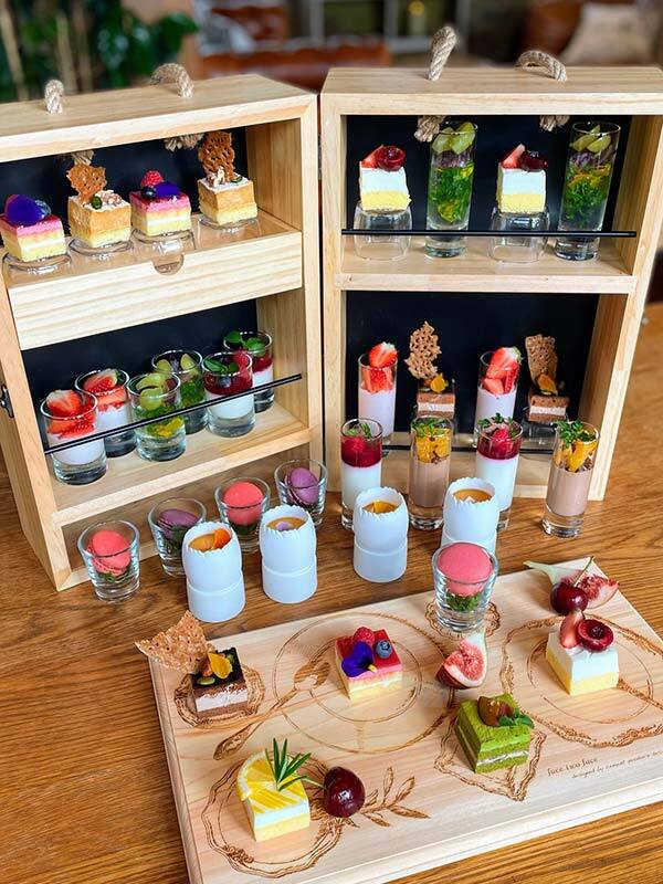 ランチメニューからお料理とお飲物(アルコール以外)をお好きなものをお選び頂き、更に季節に合わせた彩とりどりのたくさんのスイーツが詰め込まれたスイーツボックスをお食事の後に皆さんでお召し上がりください。(写真は4~5名様となります)